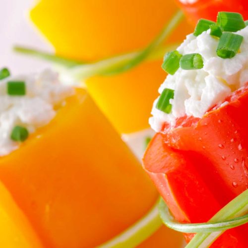 - Roll the Prime Time Bell Pepper slices into a ring and tie with a whole chive. Repeat until all the strips are used.