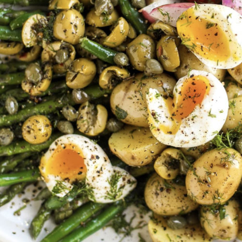 - To assemble the salad, place the green beans and asparagus on the plate first. Drizzle with a bit of the dressing and sprinkle with salt and pepper. Toss well. Top with the potatoes and radishes, then add on the capers and olives. Drizzle with more dressing and sprinkle on the chopped dill. Top the entire salad with the eggs. (If preparing this ahead of time, hard-boiled eggs are recommended.)